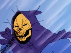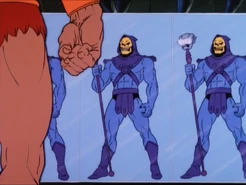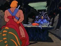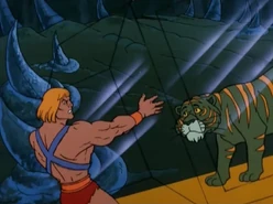 Beast Man attacks He-Man using his whip, but He-Man grabs it and pulls Beast Man through the air. Battle Cat drags Beast Man into a corner, which is then sealed off by He-Man using a large crystal slab, mimicking the glass cage Cringer was held in earlier. Evil-Lyn appears and fires a magic ray from her wand, which ricochets on the walls. He-Man ties the hilt of her wand around her arms and allows Battle Cat to drag her to the improvised cell as He-Man slides open the glass 'entrance' so that Evil-Lyn can join Beast Man inside. He-Man and Battle Cat enter Skeletor's throne room, where Skeletor orders him to escort him into Castle Grayskull. He-Man tells him to hand over his magic staff instead. Skeletor uses the staff to create a wall of mirrors reflecting multiple versions of himself. The walls on either side of He-Man and Battle Cat begin to close in on him. As they struggle to keep from being crushed, He-Man notices the vial of pepper given to Adam by Orko popping out of his harness. He throws it at Skeletor, who sneezes, destroying the mirrors one by one and revealing his true location. Battle Cat lunges at Skeletor, who flees. He-Man and Battle Cat then go to find Teela and release her. Despite Evil-Lyn's claims, He-Man is able to break the energized chains with ease. Teela wants to find Adam and Cringer, but He-Man assures her that he will make sure they get back to the palace. Instead, he asks her to concern herself with Beast Man and Evil-Lyn, and she replies that she will make sure that they are put on trial in an Eternian court of law.