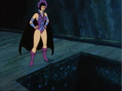Cringer has been placed in a glass cage ballancing on the edge of a rock. A trap door has been set for He-Man to fall into a pit containing the Octabeast as he approaches the rock. Cringer tries to warn He-Man it's a trap, but can't be heard from inside the cage. Performing another feat of courage, Cringer uses his weight to cause the transparent cage to tumble off the cliff, and He-Man catches it rather than stepping on the mechanism that opens the trap door. Observing from the throne room, Skeletor blames Beast Man for their plan's failure. He-Man decides to pay Skeletor a visit and uses the Sword of Power to transform Cringer into Battle Cat. Another alarm alerts Skeletor that someone else has entered his lair: Teela. She walks into the Octabeast trap and is grabbed by one of it's tentacles. Skeletor orders Beast Man to communicate with the creature and have it bring the woman to the South Entrance. Teela is chained to a wall by Beast Man, and Evil-Lyn uses her wand to energize the chains so that even He-Man won't be able to break them.