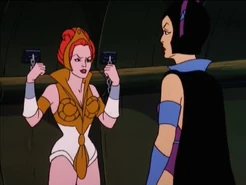 - The background crowd shot remains the same during the sequence in which the Shadow Beasts puts Teela down, making for an awkward jump cut.