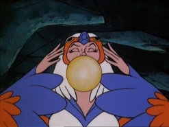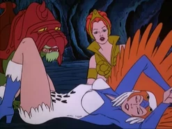 - When Teela kneels next to the Sorceress, the background segment beneath her arm is given a flesh color by mistake. This is corrected in the next close-up shot. Then a few moments later, part of the Sorceress' orange wing is missing between her arm and head.