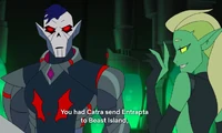 Personally, Hordak pursued personal technological research projects, which drew the interest of a recent defector to the Horde, the eccentric genius engineer, Princess Entrapta. Although initially infuriated at her intrusion, Entrapta's astute suggestions soon impress Hordak and they become close research colleagues. This relationship deepens into a friendship with Entrapta taking it upon herself to create a medically beneficial exoskeleton for him to improve his health. For his part, Hordak was perhaps grateful for the first time to have such a companion of such generosity, But he was devastated when Catra deceived him into believing that she betrayed him by letting the other princess in the Fright Zone. While his portal experiment seemed to fail it did succeed in transmitting a signal to Horde Prime.