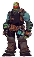 Kronis is a green-skinned humanoid, bulky and muscular in build, with black facial hair, wears a dark muscle shirt, trousers, and carries tools and weapons on his belt. He also has some kind of facial tattoo over his left eye.