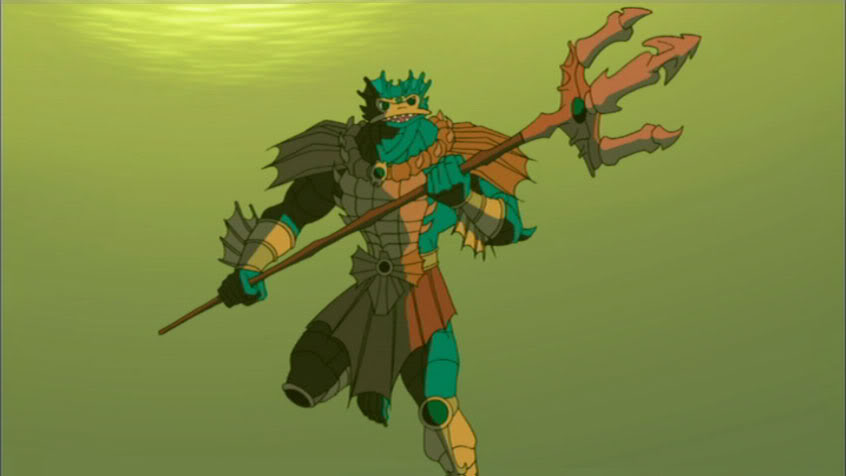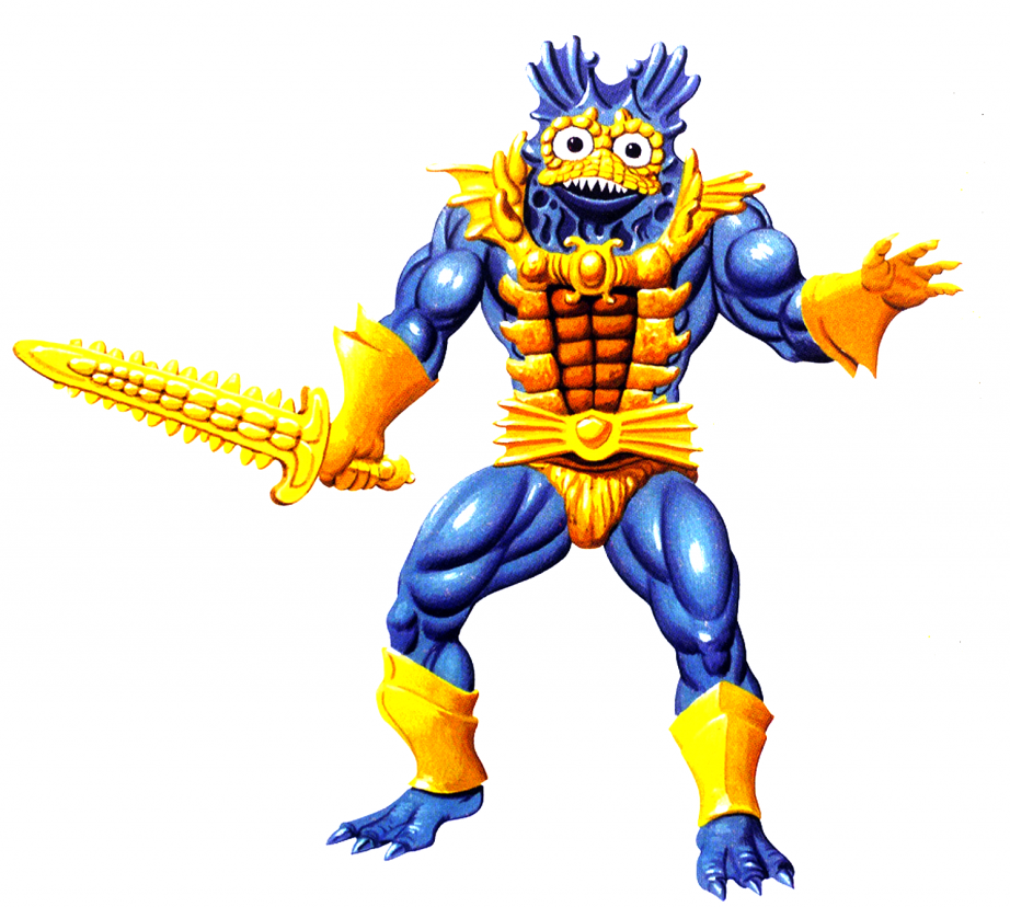 Hailing from the Crystal Sea[4], Mer-Man was an aquatic ocean warlord in service to Skeletor. Though he reported to Skeletor at Snake Mountain, Mer-Man usually dwelled within the seas themselves, and often operated independently of Skeletor and the other Evil Warriors; engineering his own water-based schemes. Mer-Man had telepathic abilities which allowed him to control other sea creatures, and had own aquatic henchmen who served as his footsoldiers[5].