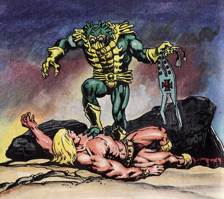 Later, Merman attempted to engage Snake Face in combat when the Snake Men returned and seized control of Snake Mountain, but was turned to stone before he could land a blow[13]. His body fell to the floor and smashed into pieces, but he was restored to life by Skeletor, breathing a sigh of relief as his body reformed[14]. Later, Merman claimed the body of Snake Face (himself turned to stone by this point) as a trophy for his lair[15].