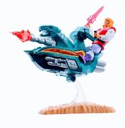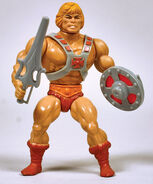 In the initial Mattel toy line, the original He-Man and Skeletor figures each came with half of a flexible plastic sword which could be joined into one "complete" sword, corresponding to the storyline in the included minicomic. Each half was cast in the same plastic color as their figures' other accessories - He-Man's in silver, and Skeletor's in purple. The sword halves were re-issued unchanged with Battle Armor He-Man and Skeletor. He-Man's half was also re-cast in golden yellow plastic to be issued with Thunder Punch He-Man, and magenta plastic when issued with Prince Adam. Skeletor's half was re-issued unchanged with Dragon Blaster Skeletor, while it was re-cast in orange plastic and issued with Faker, representing a copy of the original Power Sword.