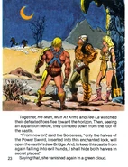 The next illustrated book, King of Castle Grayskull, reveals where the two halves have been hidden: one at Eternia's "highest point", the other beneath its "hardest rock". Whoever finds them can claim the throne of Castle Grayskull and the "secrets of the universe". The "highest point" turns out to be the top of Stratos's mountain, while the "hardest rock" is the rock where He-Man built his home in the previous book. As expected, the Jaw-Bridge opens once the two halves have been inserted into the lock, but then Skeletor loses the sword again in battle. The book ends with the Spirit of the Castle sending the two halves into another dimension, where Skeletor is not expected to find them easily. The Power Sword is not featured in the last two books of the first series, Battle in the Clouds and The Vengeance of Skeletor.