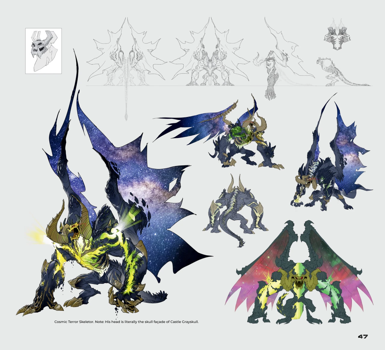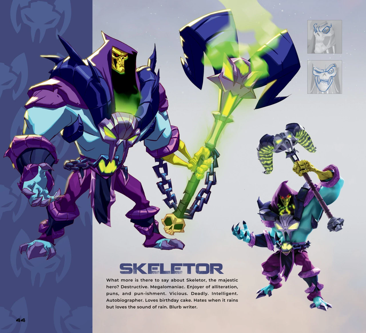 Skeletor is noticeably taller and more muscular than his original self, but also has blue skin and animalistic feet. His face has been reduced to a skull with red glowing pupils, although his left hand and forearm are still exposed bones, and he carries his Havoc Staff. He wears a purple hood over his skull for a head which has glowing red eyes, and a chest plate shaped like a ram skull where the horns go over his shoulders.