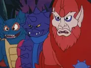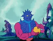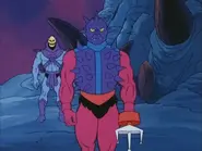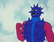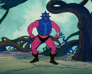 However, despite the heavily toned-down portrayal of his character, he comes across significantly differently in the episode Visitors from Earth. Although he only appears briefly, in this episode he comes across as a silent, menacing, zombie-like character in complete contrast to his other appearances. At one point, the screen fades to black as Skeletor sets him towards a captive, hinting at some kind of horrific use of his spikes; the only point at which Filmation acknowledged the character's potentially deadly abilities which were too extreme for them to show. Another notable point of this episode is that it is the only episode in which he has the trident arm of the toy; in other episodes, the trident is excluded in favor of a normal hand so he could appear symmetrical, thus allowing the animators to flip over the character cels.