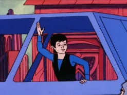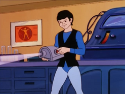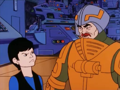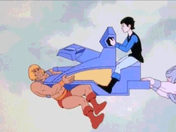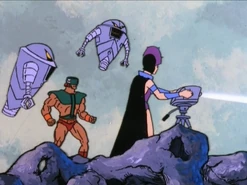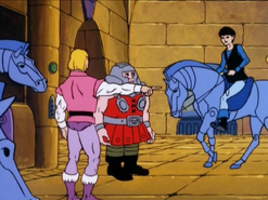 Adam introduced Jeremy to Man-At-Arms and Orko in Man-At-Arms' Laboratory. Orko offered to show Jeremy some magic, but the young royal was more interested in one of Duncan's new inventions: the Rock softener. Without asking, Jeremy decided to test the device on the legs of one of the laboratory tables, causing it to collapse and spill it's contents. Duncan reminded Adam that he needed him to test the Rock softener out on the plains. Therefore, the Prince asked Ram Man to keep an eye on Jeremy. Soon, the royal cousin was forcing Ram Man to humiliate himself by catapulting into a pond in the royal courtyard. With Ram Man distracted, Jeremy took off on a Sky-Sled, despite Adam having told him he could not use any of the vehicles. Ram Man managed to jump and grab on to the sled, but then found himself hanging on to it as Jeremy refused to stop.