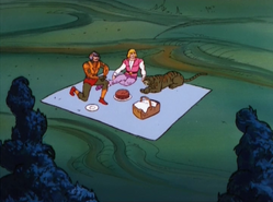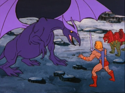 - He-Man, Man-At-Arms and Battle Cat are seen travelling to Dragosaur Isle on a raft. Later, Orko is also with them on the island, even though he was not present on the raft.