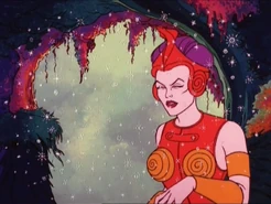 - The sequence of the Sorceress transforming into Zoar the falcon and flying over Orko's head, who makes himself disappear afterwards, was first used in Teela's Quest.