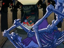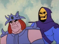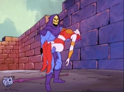 - When Skeletor rises from his Bone Throne to receive the Wheel of Infinity from Darkspy, in the wide shot, Skeletor is considerably smaller in size than usual and is standing on the throne's seat instead of in front of it. The table that Tri-Klops and Fang Man sit at is also different and smaller than usual, and they are seated on two stone blocks that were never there before.