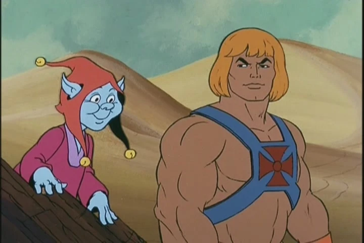 Suddenly a strange little blue fellow bursts out of the bottle, along with a robotic companion. Orko realizes that they are from Trolla, or more specifically, Karadania, the "land of practical jokers." The stranger introduces his robot as Blinker, but will only identify himself as "Prankster." Orko explains that Karadanian magic would summon Prankster home if he were to say his real name aloud. Prankster has no intention of letting that happen, as he means to have "fun" with the heroes for a very long time. He and Blinker disappear to plan their next joke, and soon Battle Cat is growing a comically enormous mustache from his snout. Orko uses his magic to remove the whiskers, though they quickly reappear on his own head. He-Man resigns himself to putting up with Prankster's shenanigans for now, so he and his friends return to the Attak Trak to continue their journey.