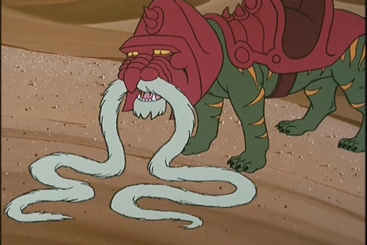 Later, He-Man, Battle Cat, Teela, Man-At-Arms, and Orko take the Attak Trak across the Sands of Time on their way to the ceremony. The others find this peaceful mission relaxing, but Battle Cat is impatient for some action. To the tiger's relief, the Trak encounters an enormous glass bottle lying in its path, and the heroes head out to investigate it. Battle Cat is suspicious of the artifact, but Orko casts a spell to uncork it, revealing a message warning against opening the bottle.